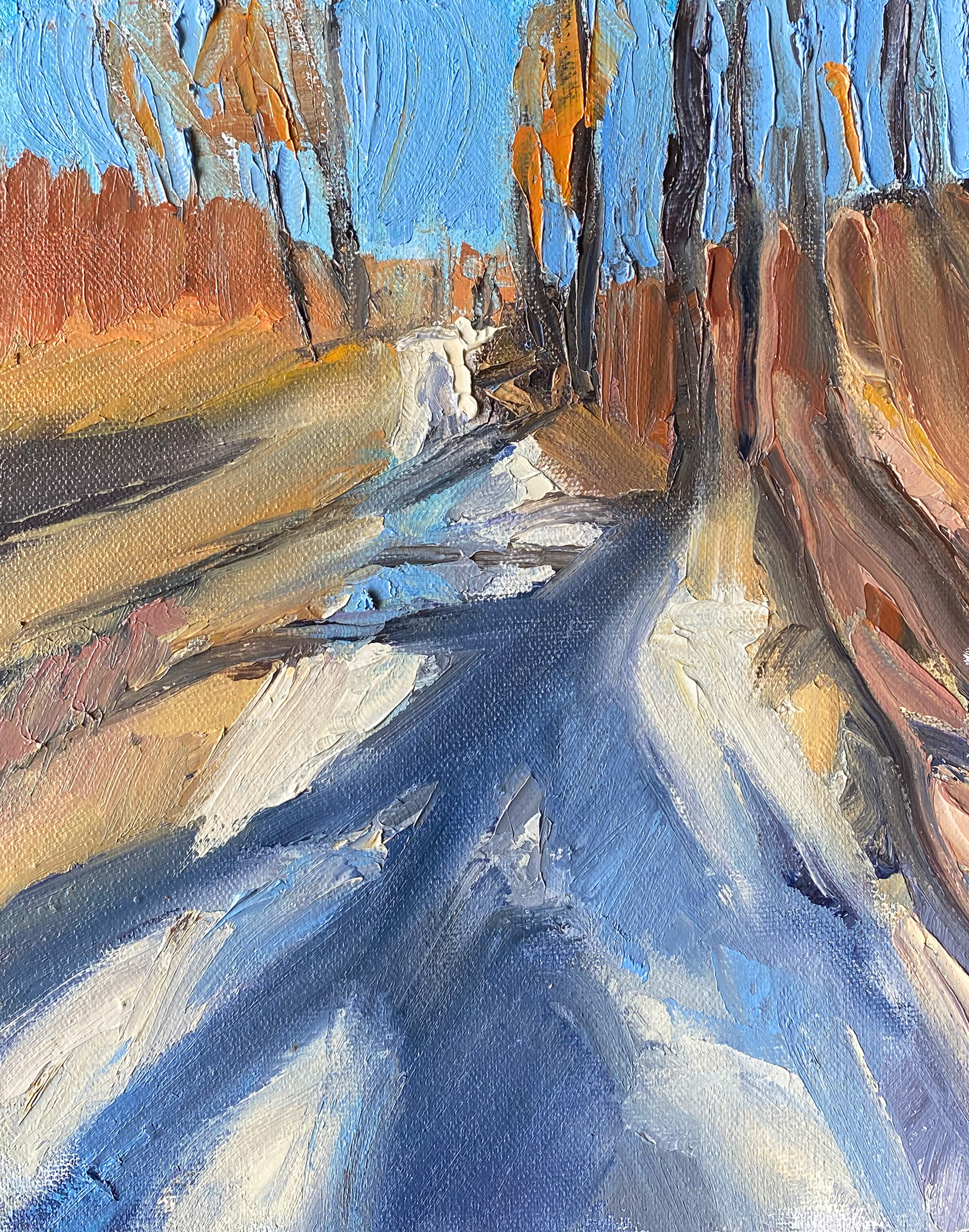In this work, I am contemplating the local nature around me, around my neighborhood, the places that are subject to destruction by development. Each of these locations is in walking distance to my home and my relationship to the trees, to the quiet spaces that are freely provided, has increased over the last few years to the point where I feel the trees, feel the beauty and the power of their presence.